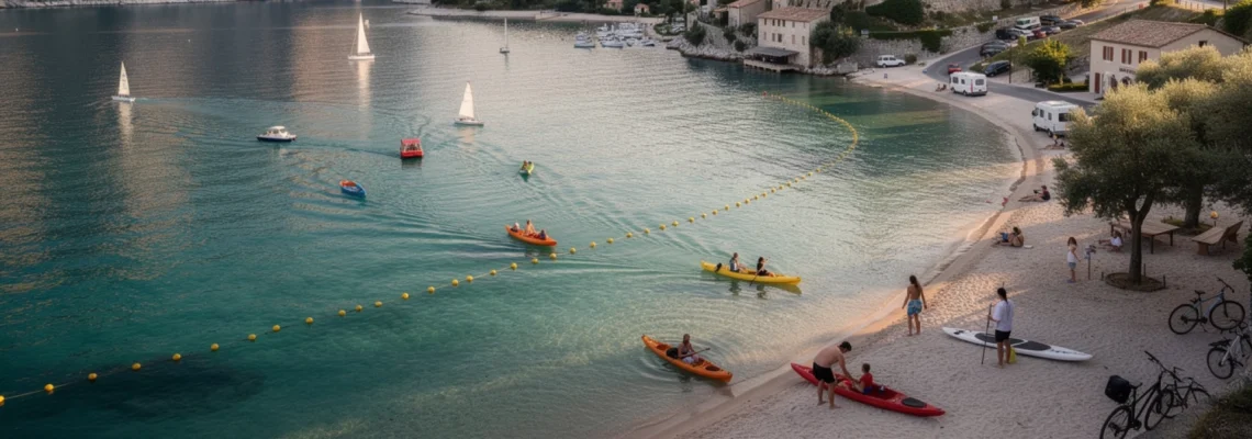 La coexistence entre baigneurs et embarcations à propulsion douce impose un zonage précis autour du lac de Sainte-Croix. Des lignes de bouées délimitent les zones réservées à la baignade, où toute navigation est interdite, et les couloirs d’accès des paddles, kayaks ou bateaux électriques. Cette organisation limite les risques de collision et clarifie les usages pour tous.