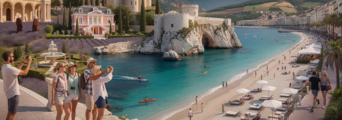 À Nice, la Promenade des Anglais déroule sur près de 7 kilomètres son ruban de palmiers et de façades Belle Époque le long de la baie des Anges. Aménagée au XIXe siècle par la communauté britannique hivernant sur la Côte d’Azur, elle incarne aujourd’hui l’image même du tourisme balnéaire niçois. Le Negresco, palace inauguré en 1913, avec son dôme rose et sa façade néo-Louis XVI, illustre à merveille le raffinement architectural de cette période. En contrebas, les plages de galets alternent espaces publics et établissements privés où l’on déjeune les pieds presque dans l’eau. Se promener sur la « Prom' », que ce soit à vélo, en roller ou à pied, permet d’apprécier l’harmonie entre mer, ville et montagne qui fait la singularité de Nice.